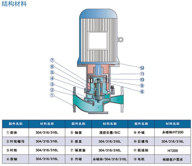 2、材質優良,泵體、葉輪、隔離套等過流部件均采用優質不銹鋼制造;