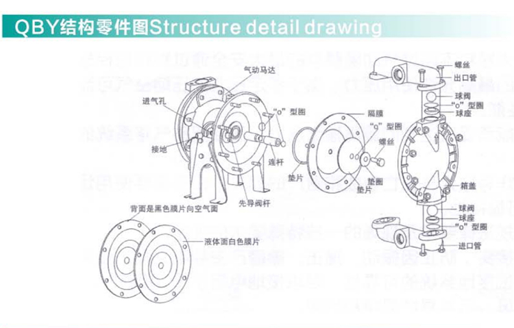 QBY氣動(dòng)隔膜泵既能抽送流動(dòng)的液體,又能輸送一些不易流動(dòng)的介質(zhì),具有自吸泵、潛水泵、屏蔽泵、泥漿泵和雜質(zhì)泵等輸送機(jī)械的許多優(yōu)點(diǎn)。