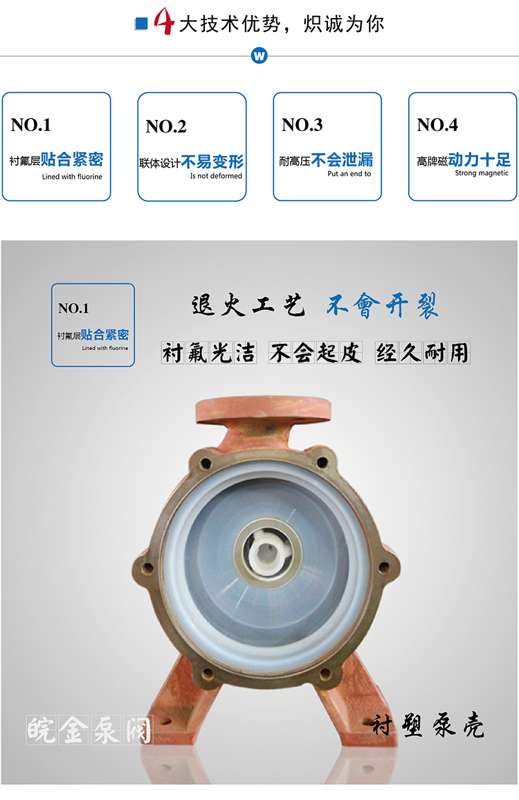 氟塑料磁力泵又稱其為氟塑料磁力離心泵、氟塑料磁力驅動泵、耐腐蝕磁力化工泵,CQB-FT襯塑磁力泵是我公司氟塑料磁力泵中的全新升級款型。氟塑料磁力泵另有:CQB-F經典型、CQB-FA長支架型、IMD后拉式重型。