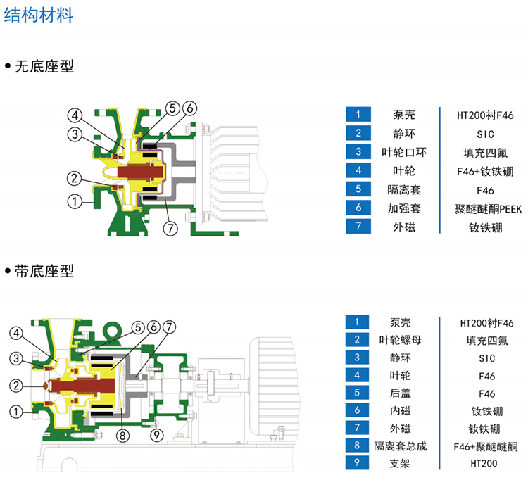 功能上:由于以上的結(jié)構(gòu)設(shè)計(jì),材料配置,WJC-FJ系列磁力泵,可輸送含任意濃度的腐蝕性液體、高溫強(qiáng)酸強(qiáng)堿等。我公司氟塑料磁力泵,襯氟磁力泵也是市場(chǎng)上耐酸堿磁力泵和耐腐蝕磁力泵理想的磁力泵廠家